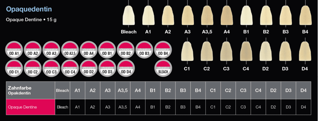 Dentine opache per la linea di ceramica convenzionale da sovracottura di supporto alla intensificazione delle dentine di base. Classica è una ceramica adatta alla stratificazione su strutture in leghe nobili, semi nobili, in cromo cobalto, nichel cromo, leghe sottoposte a fresatura e laser melting.
